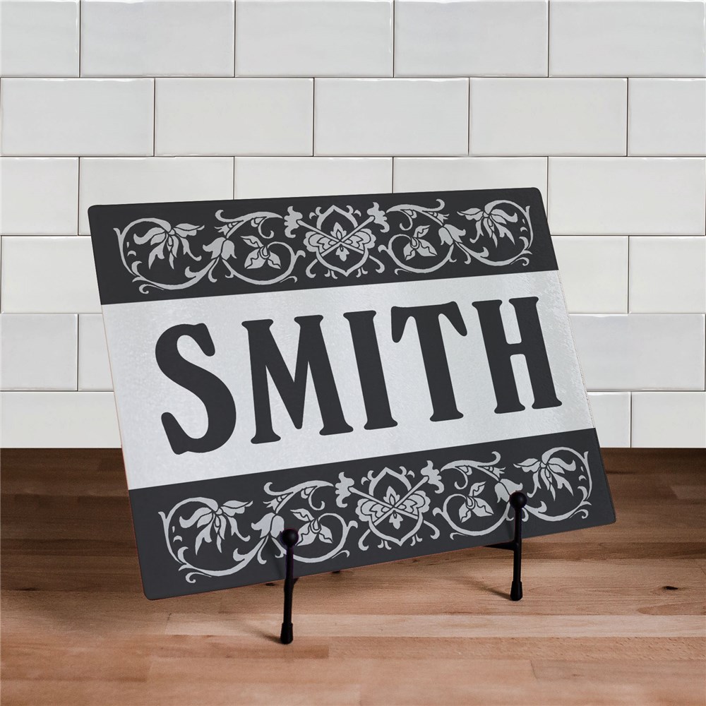 Our personalized kitchen cutting board is a large glass cutting board with 30mm radius corners and measures 15 ¼” x 11 ¼”. This heat resistant glass cutting surface is dish washer safe. Arrives with self-adhesive rubber feet. Includes FREE personalization. Personalize with any family name.
