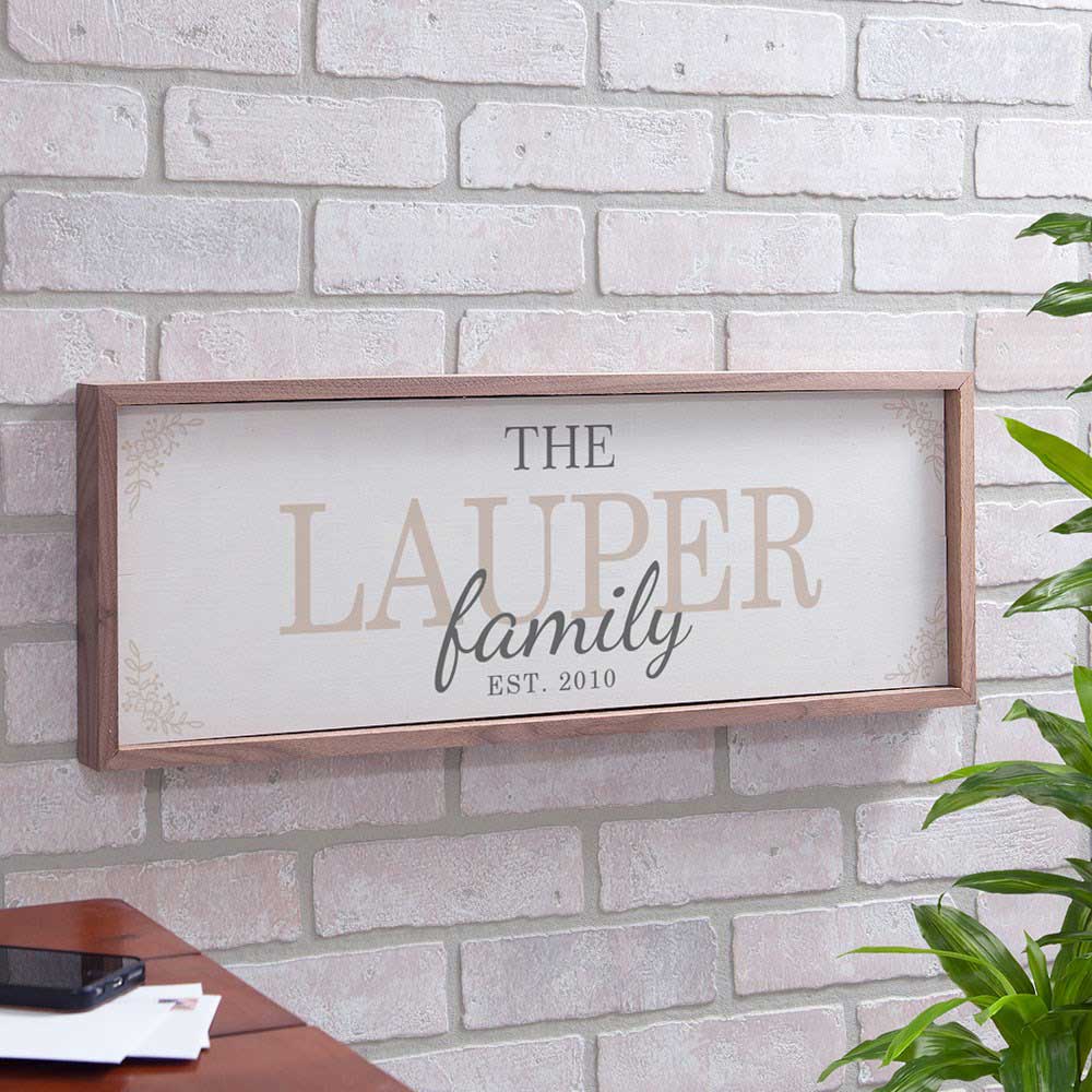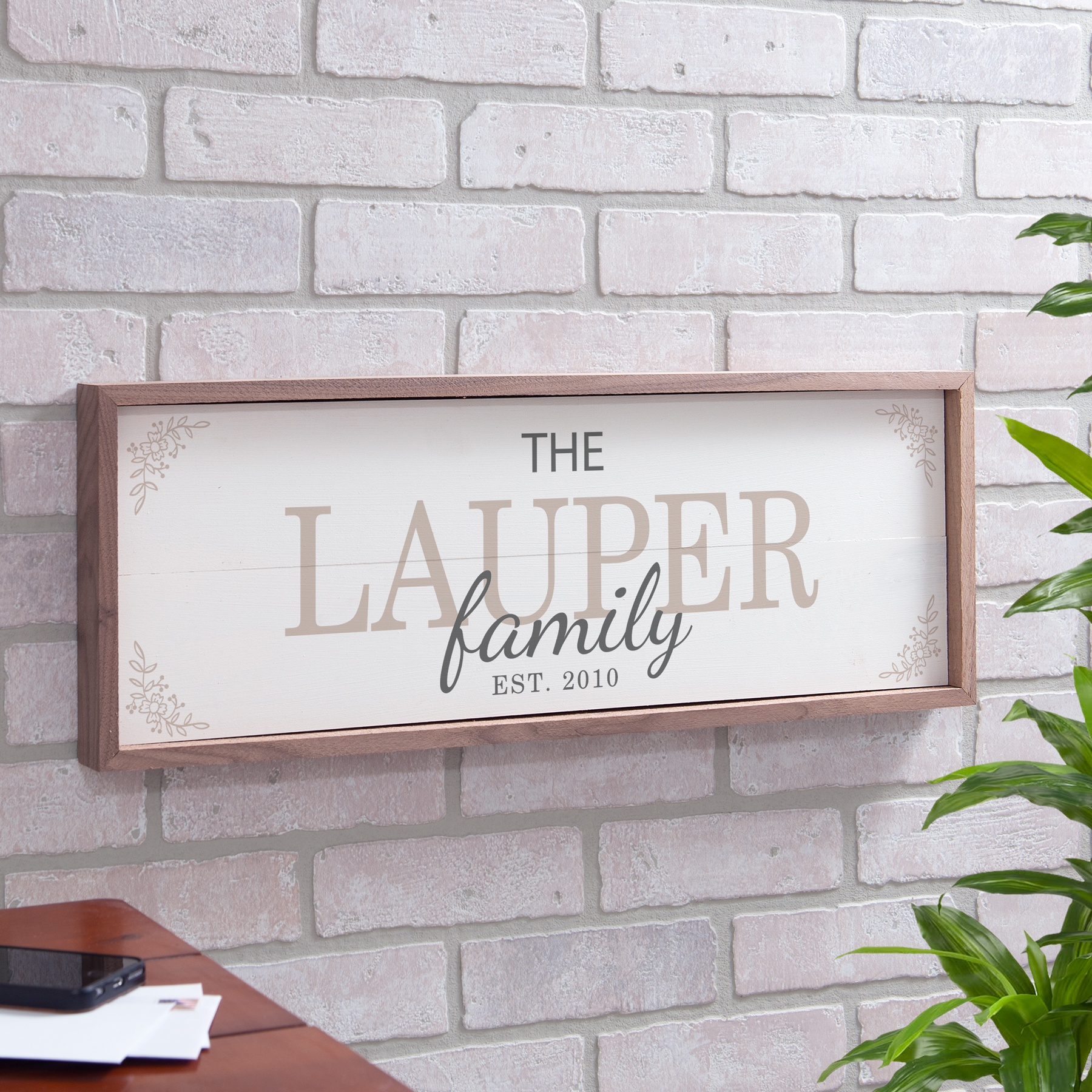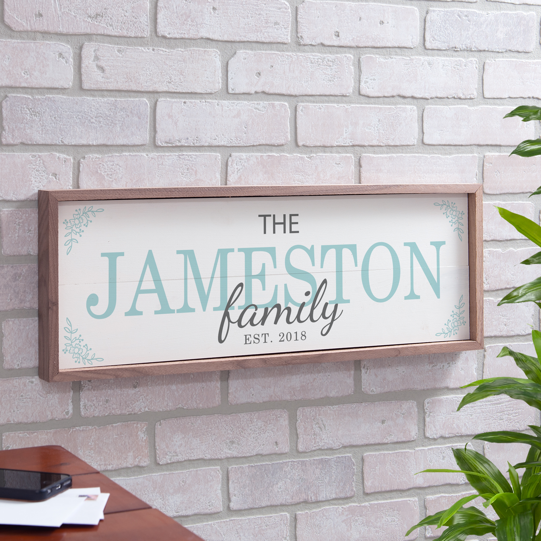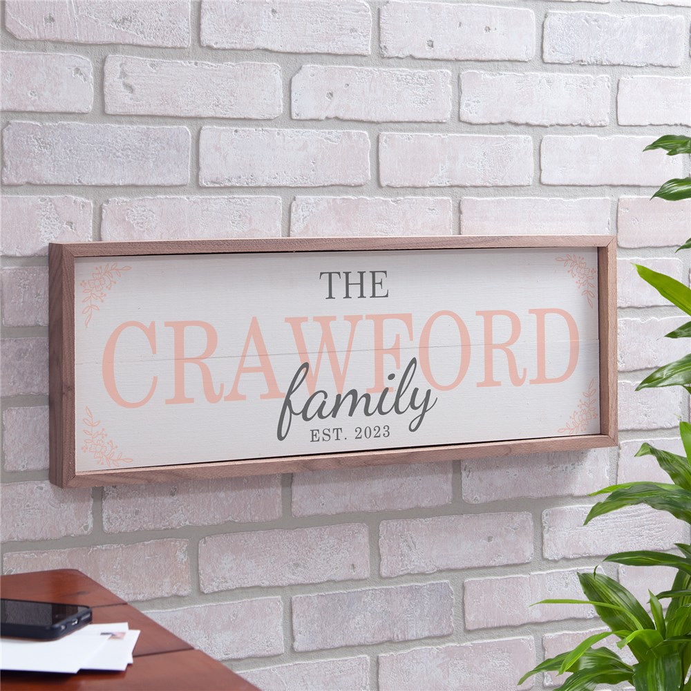 This wood framed Family Name Wall Art may be personalized with your choice of design color, any family name and custom message line.