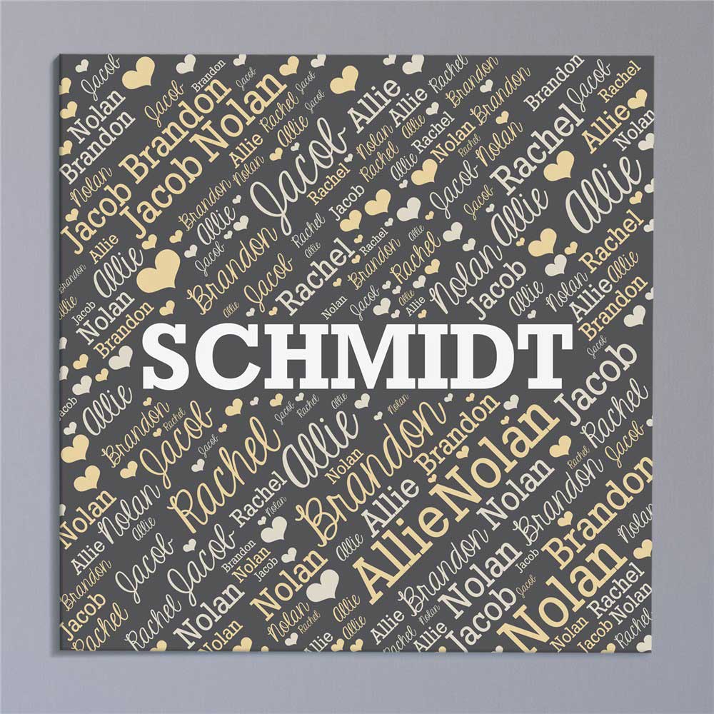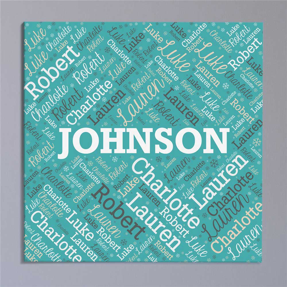 Design a one of a kind canvas to hang in your family home that showcases each member in a unique way with our exclusive word art tool. Our Personalized Family Name Signs are creative, personalized housewarming gifts for any home. The names on this Word-Art Canvas will wrap around the sides of the square canvas.