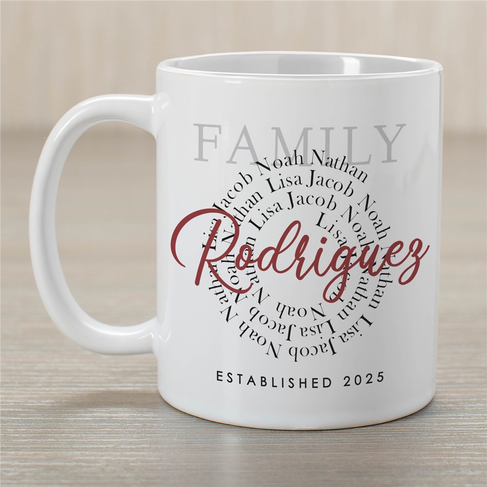 Create your own coffee mug to showcase your whole family with this Personalized Family Spiral Word Art Coffee Mug.Using our spiral word art tool, add in each of your family members name, on separate lines, and we will put it into a spiral formation! Add any 3 custom message lines of your choosing. Line 1 where it says "family", line 2 where it says the last name, and line 3 at the bottom.