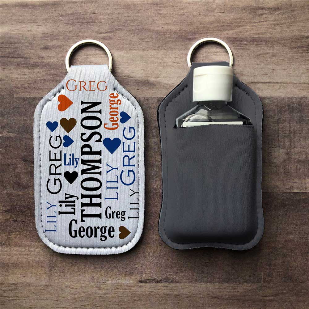 Always keep your hand sanitizer with you using our Personalized Family Word Art Hand Sanitizer Holder.
