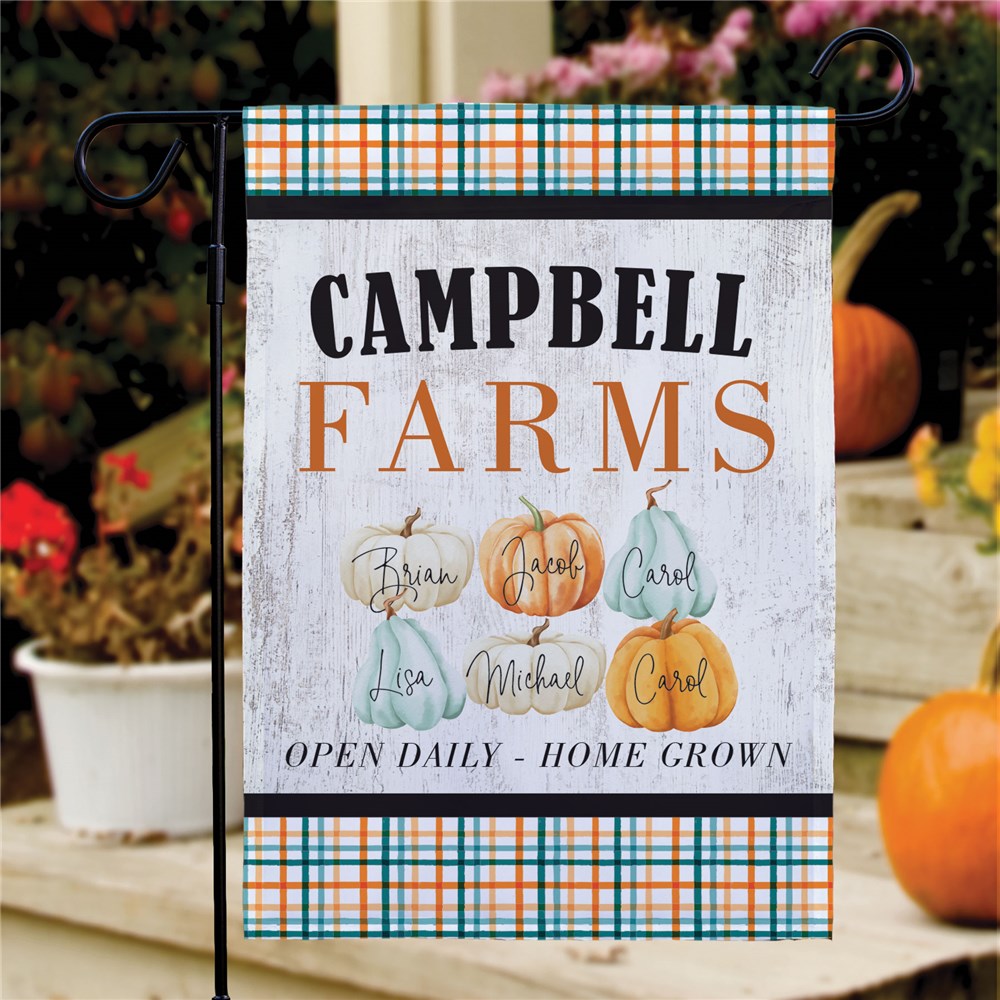 Your family can welcome the fall season with our Personalized Farm Pumpkin Family Garden Flag displayed in your front yard!