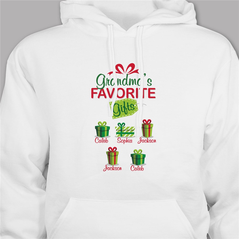Our Personalized Favorite Gifts Hooded Sweatshirt is ideal holiday apparel for Grandma this Christmas!