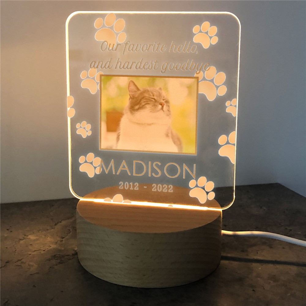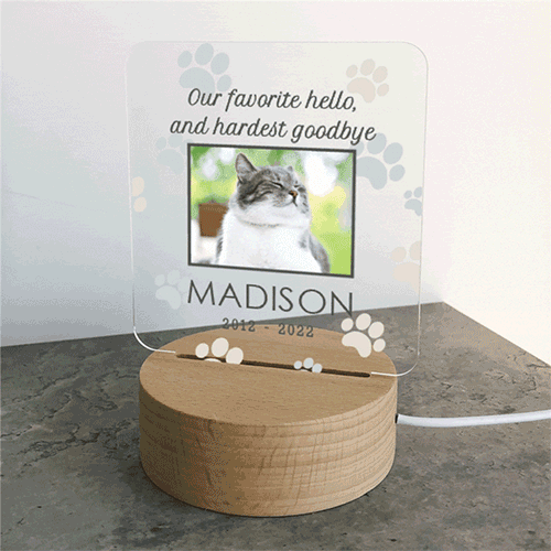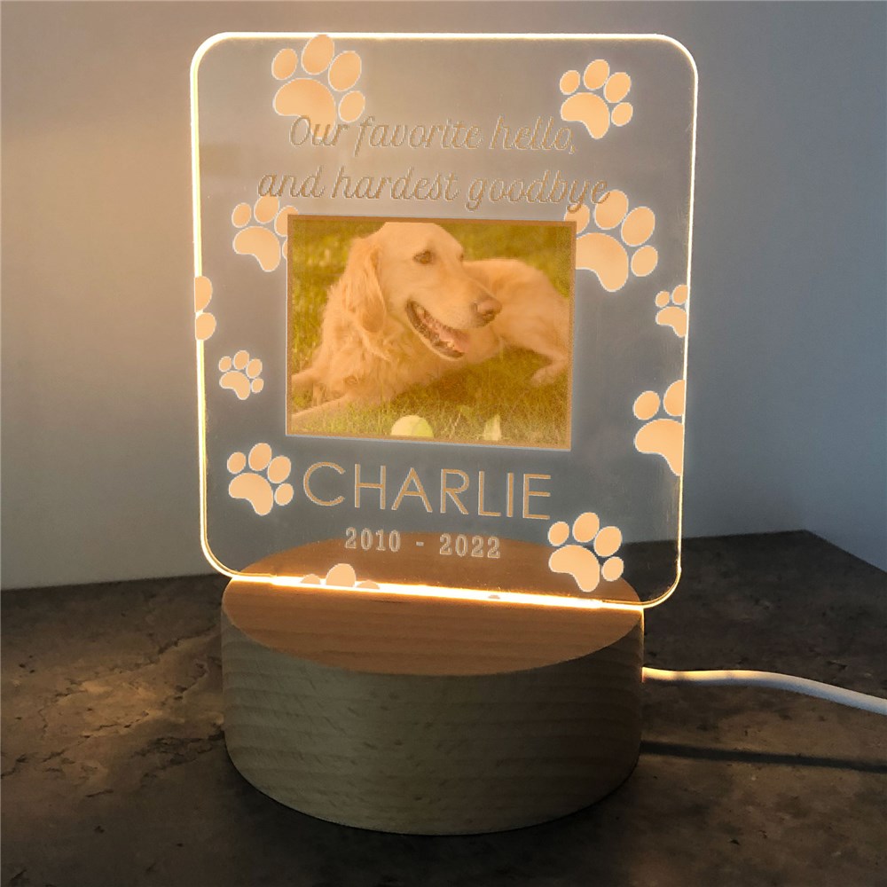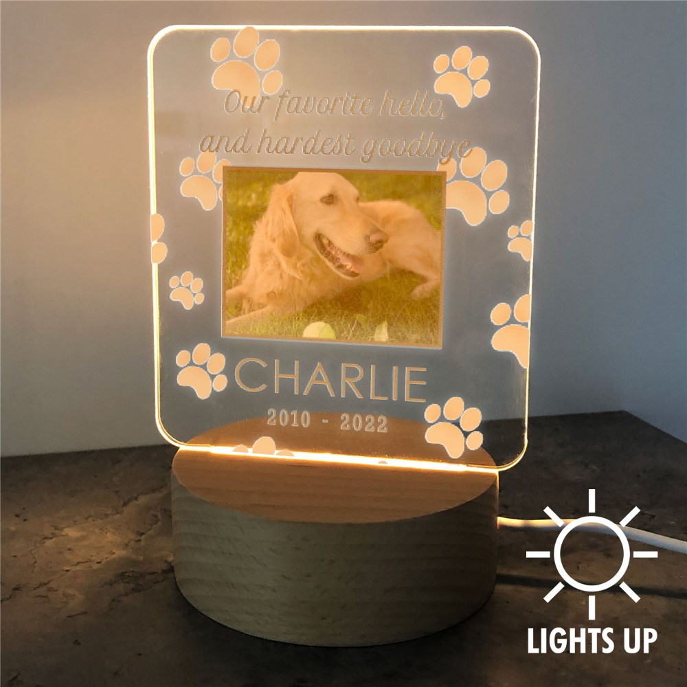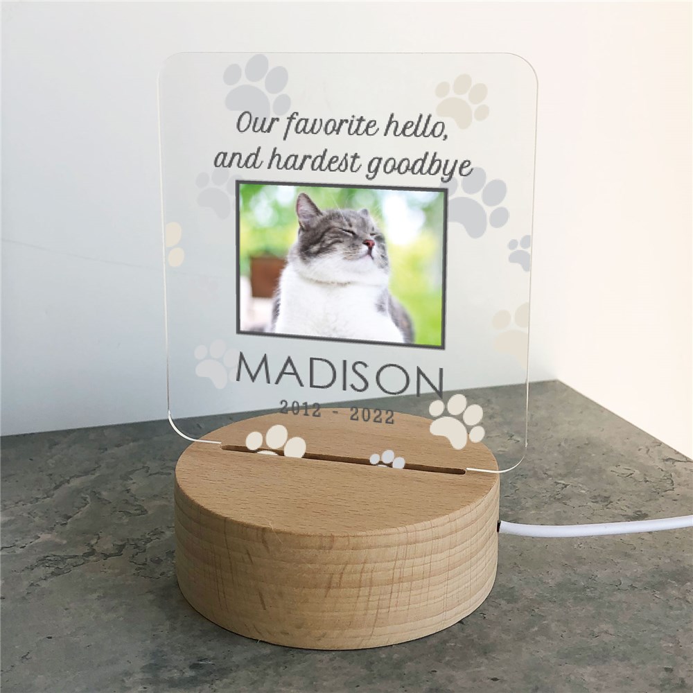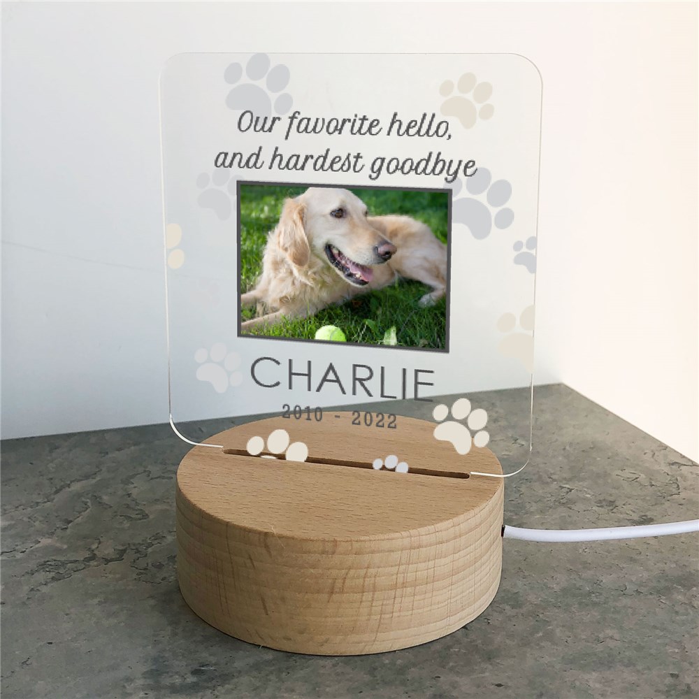Honor your beloved pet with our Personalized Favorite Hello Hardest Goodbye Square Light Up Sign.