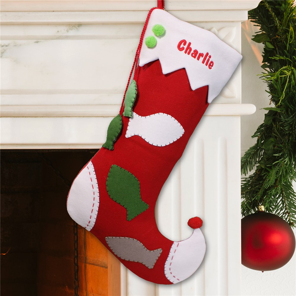 Got a fisherman in the family? This adorable embroidered Christmas stocking with fish is sure to please. Have a furry feline you want to include this holiday season? Personalized Christmas Stockings like this look great on the mantel so you can include your pet in the fun! This embroidered stocking will be personalized with any name (pet or human) on the cuff in red.
