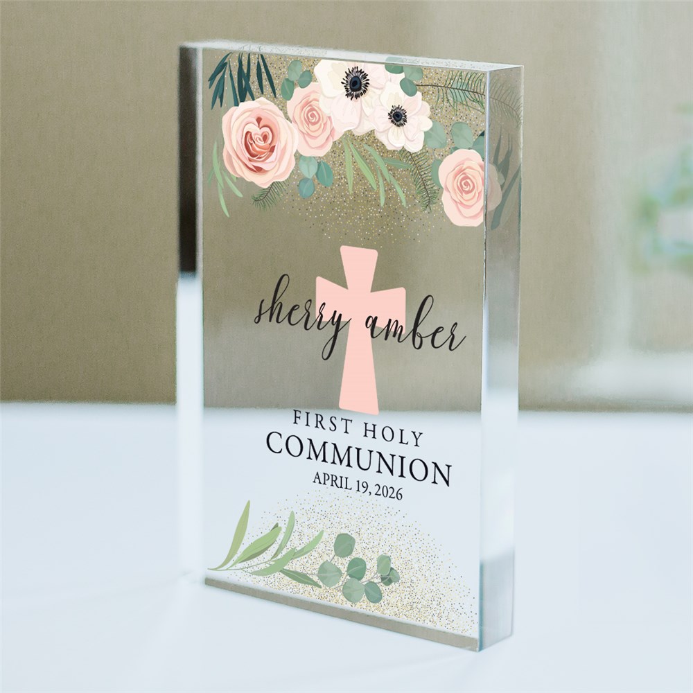 Remember this special occasion in your child's life with our Personalized Floral Glitter Cross Acrylic Keepsake!