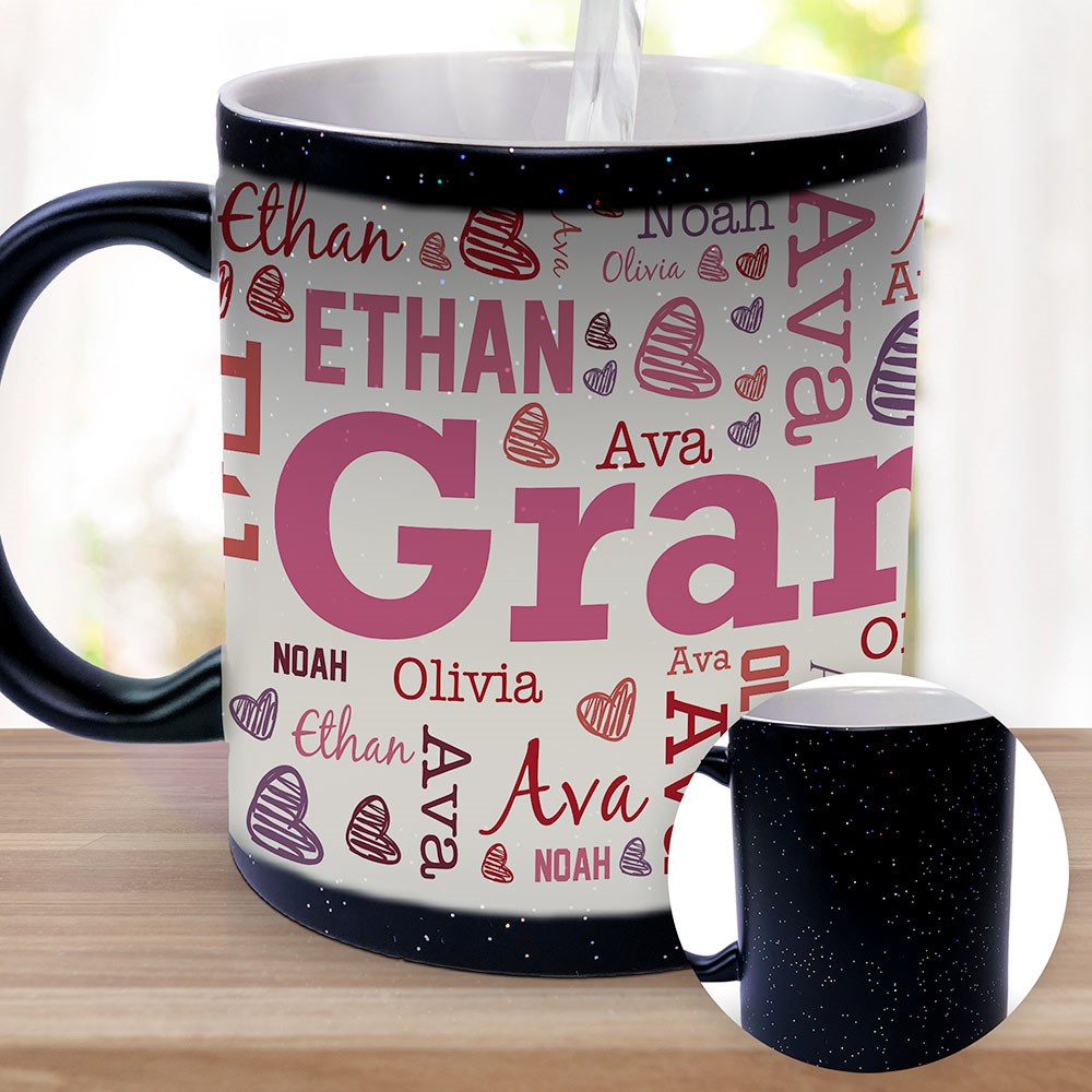 This unique piece of drinkware changes color when hot liquid is poured inside to reveal a fun word art design.