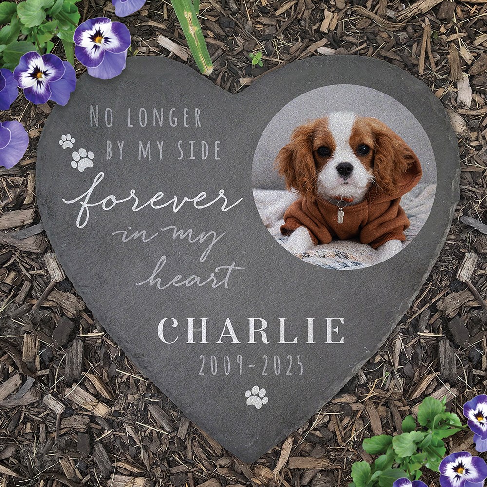 Honor the memory of your cherished pet with this Personalized Forever In My Heart Pet Photo Heart Slate Stone.Upload a photo of your furry friend and personalize it with their name and memorial years to create a touching, one-of-a-kind tribute for your garden, memorial space, or home.