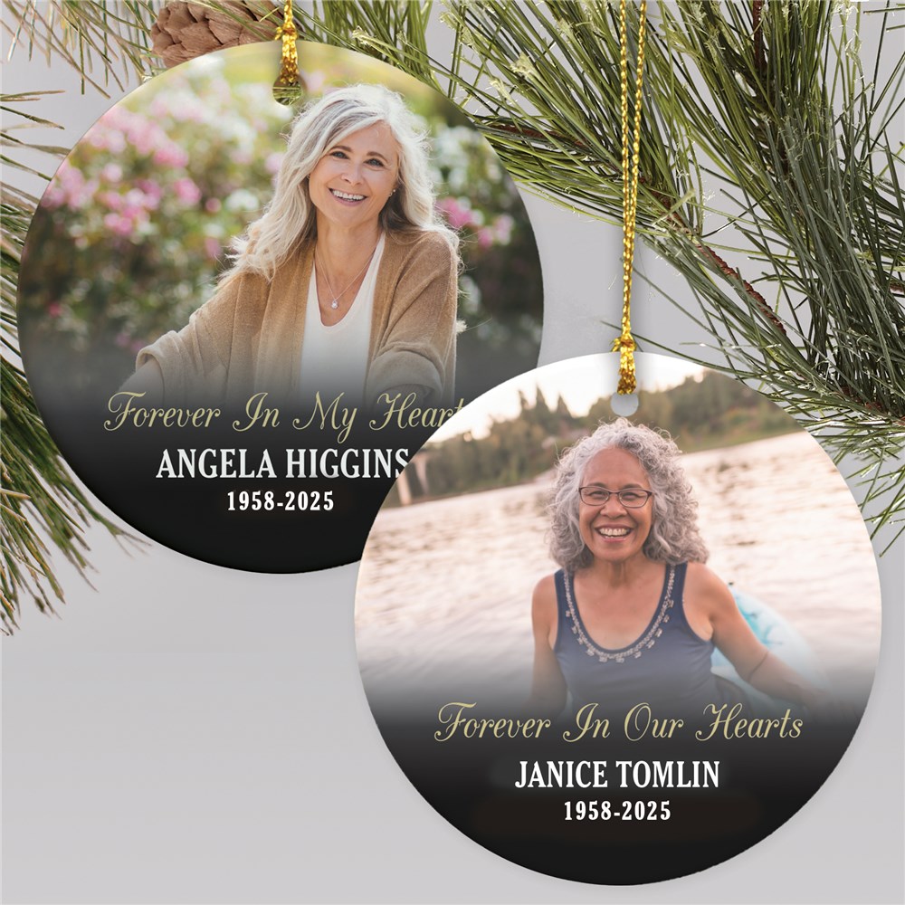 Keep your lost loved ones near this holiday with our Personalized Forever My Heart Photo Round Ornament