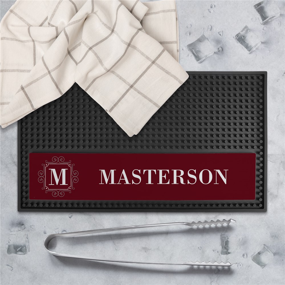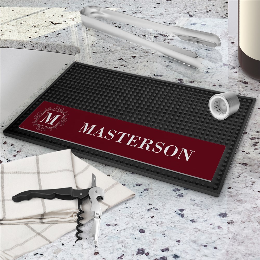 This Personalized Framed Initial Rectangle Bar Mat combines functionality with style. Customize with your initial and family name, plus choose from several color options to match your home décor.