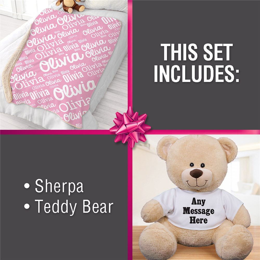 This 2 piece set includes a soft and warm sherpa blanket as well as an adorable teddy bear to hug while they fall asleep.