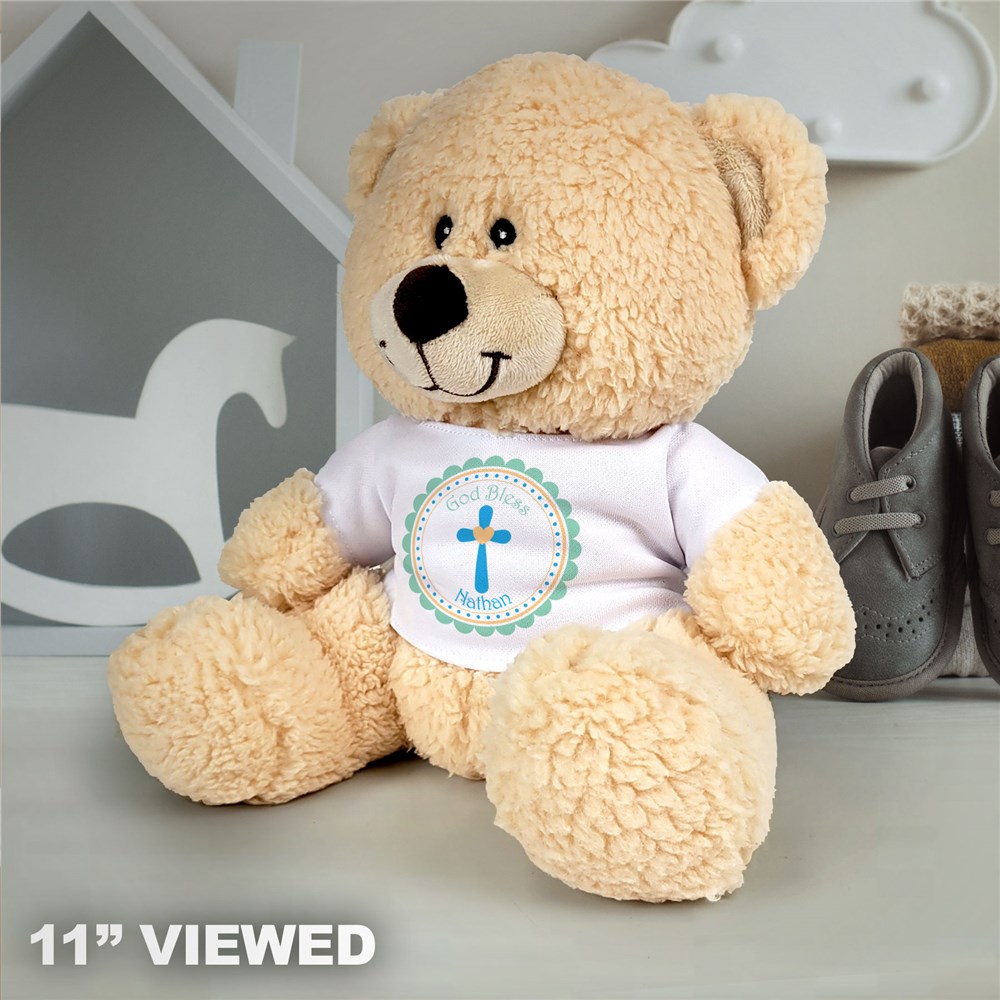 Whether you're celebrating a Christening, a First Communion or any special day, this wonderfully soft and cuddly personalized God Bless teddy bear is a gift that is sure to become a treasured friend for life. This adorable Sherman teddy bear is wearing a t-shirt that features a cross and will be personalized to say God Bless your child's name (up to 12 letters). This custom God Bless stuffed animal has an irresistible look on his face and contrasting tan fur on the inside of his ears and snout, and he comes in three great sizes: 11, 17" and 21" (gift box available for 11" only). Shop our selection of personalized baptism gifts and christening keepsakes today.
