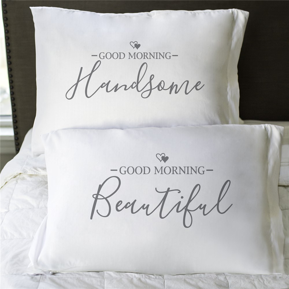 Wake up every morning with happy thoughts when you use this Personalized Good Morning With Hearts Pillowcase Set.