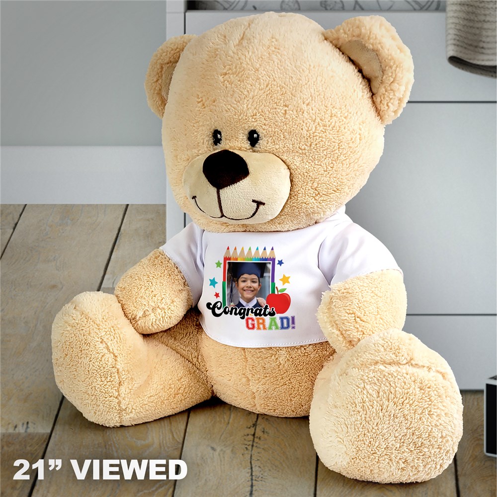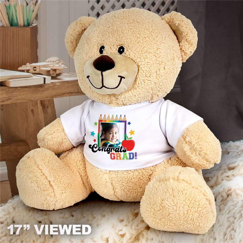 Celebrate your little graduate with the cutest keepsake of the year!This soft and cuddly Personalized Grad Photo With Class Signatures Sherman Bear comes dressed in a custom t-shirt featuring your uploaded photo surrounded by playful colored pencils and the cheerful message "Congrats Grad!"