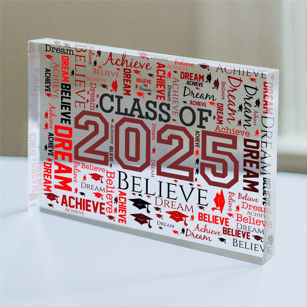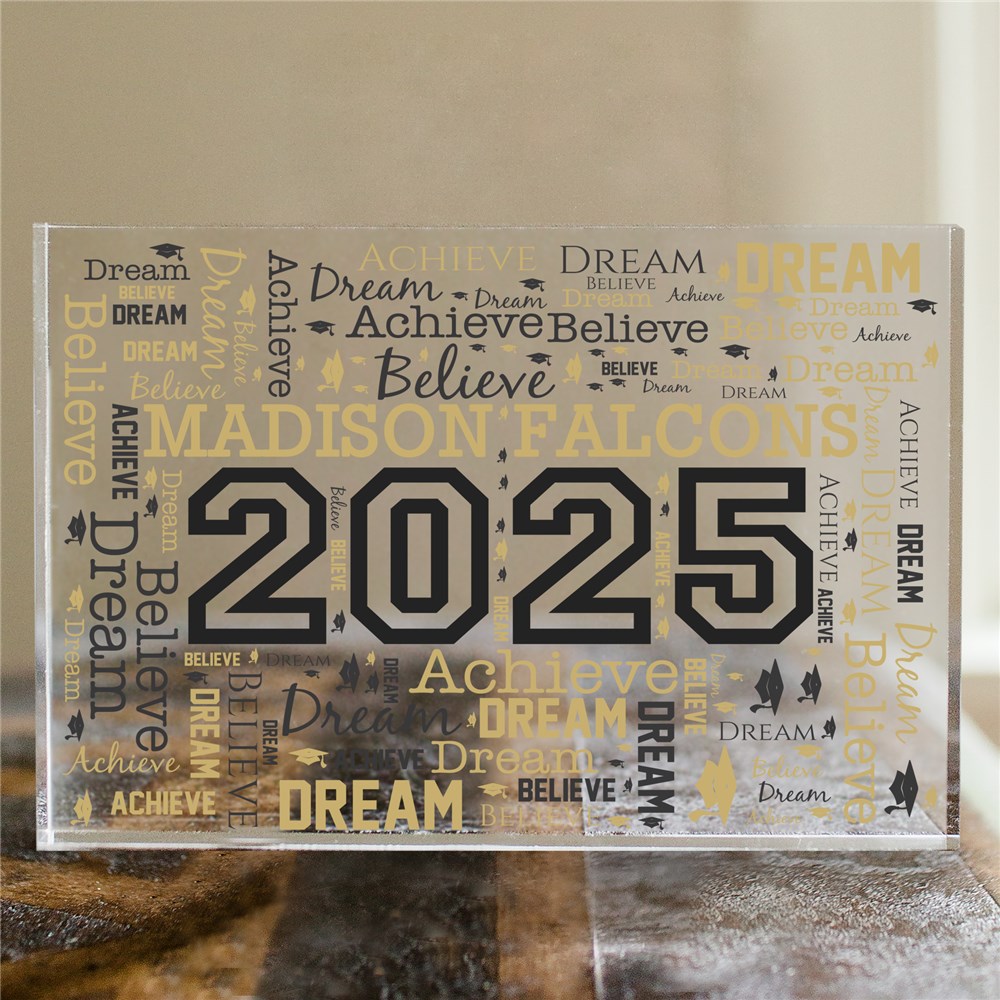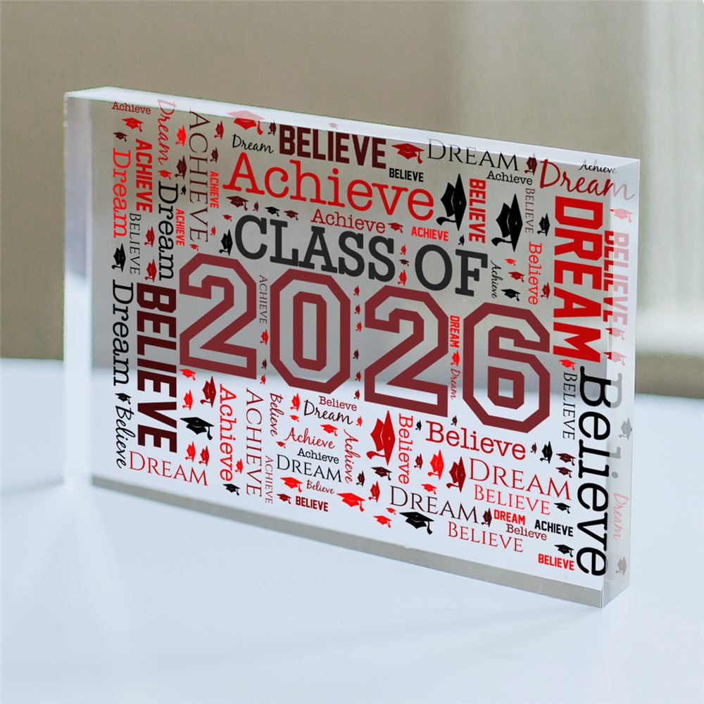 Create a one-of-a-kind keepsake for your graduate with our Personalized Graduation Word-Art Acrylic Keepsake.Using our word art tools, create this keepsake with any words you'd like to see in the design. Just add any custom message line and the year.