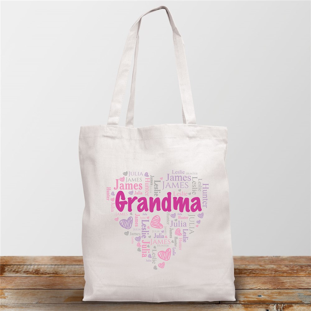 Let Grandma or Mom show off the loves in her life with a unique word art presentation of her grandchildren or children. Each day as she goes about her errands she can tote her essentials in this one of a kind bag! Customize these Personalized Mom Gifts with any family name and the first names of all your family members.Recommendations: