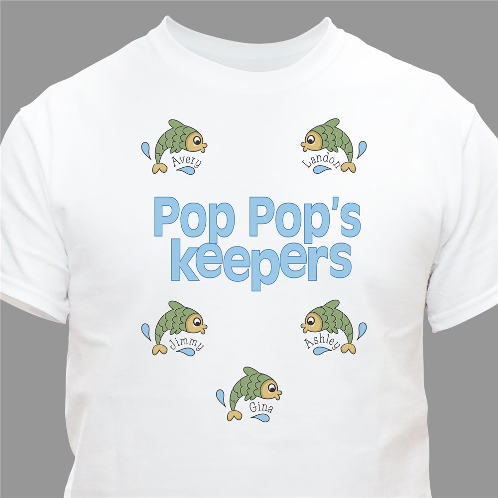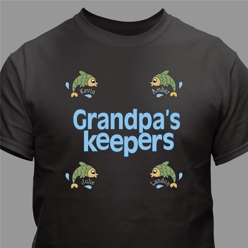 Celebrate grandpa's love for his grandchildren and fishing at the same time with this Personalized grandpa's keepers fish t-shirt! Great as Father's Day Presents For grandpa. Personalize your Grandpa shirt with any title and any names of your special "keepers" for an item any grandpa or special man in your life will love. Shop Father's Day gifts now.