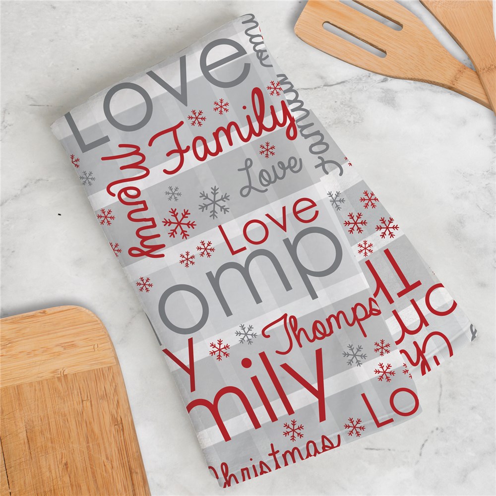 Bring some holiday cheer to your kitchen with our Personalized Gray Plaid Holiday Word Art Dish Towel.