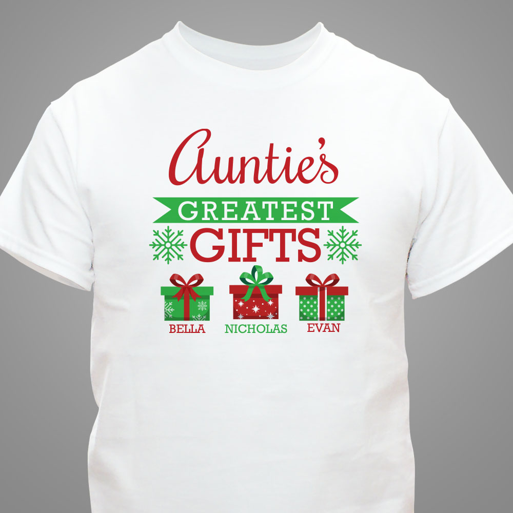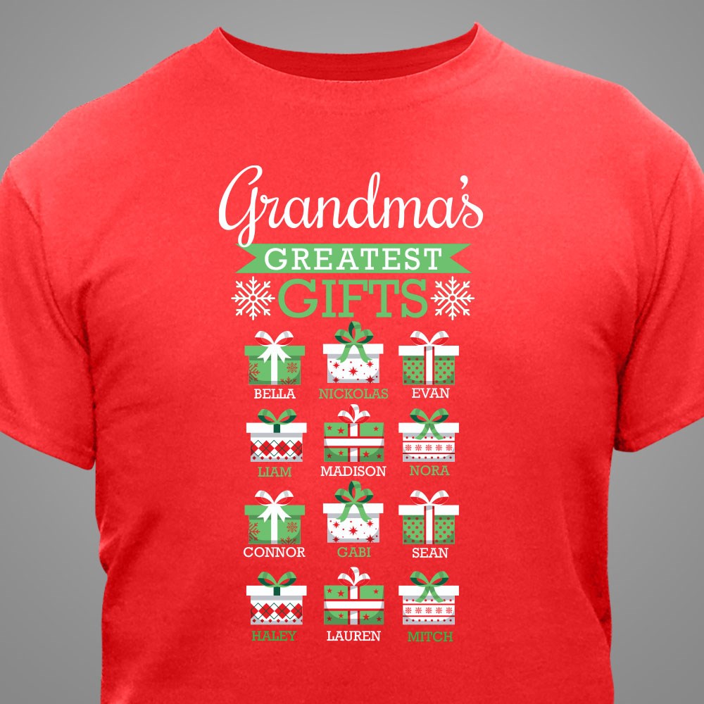 She will love to show off her greatests gifts in life with our Personalized Greatest Gifts With Presents T-Shirt.This unique Personalized Holiday T-Shirt gift can be created with any title and up to 12 names on your choice of t-shirt color.
