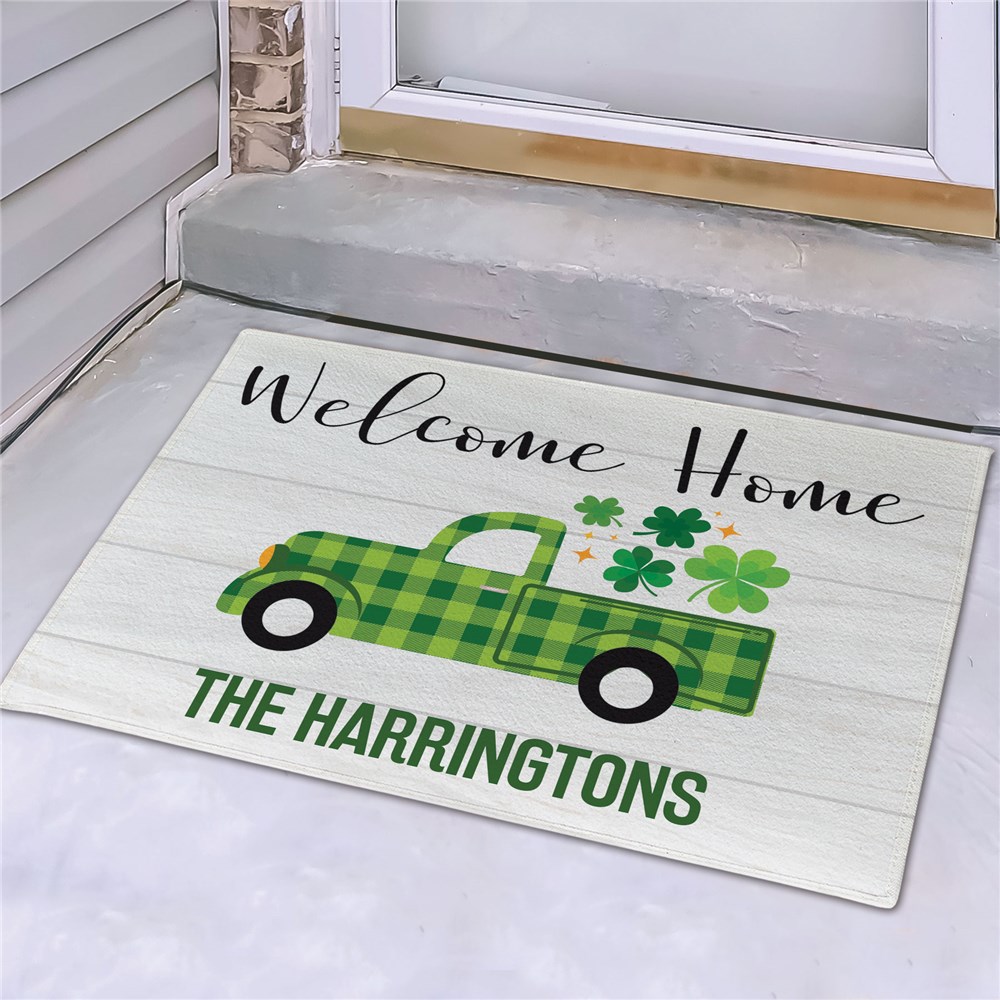 Featuring a plaid truck with clovers, this charming doormat can be personalized with any custom message line.