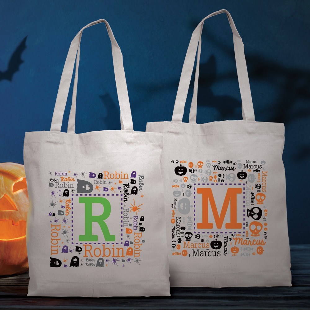 Make trick or treating an even more memorable experience with our Personalized Halloween Initial Word Art White Tote Bag!