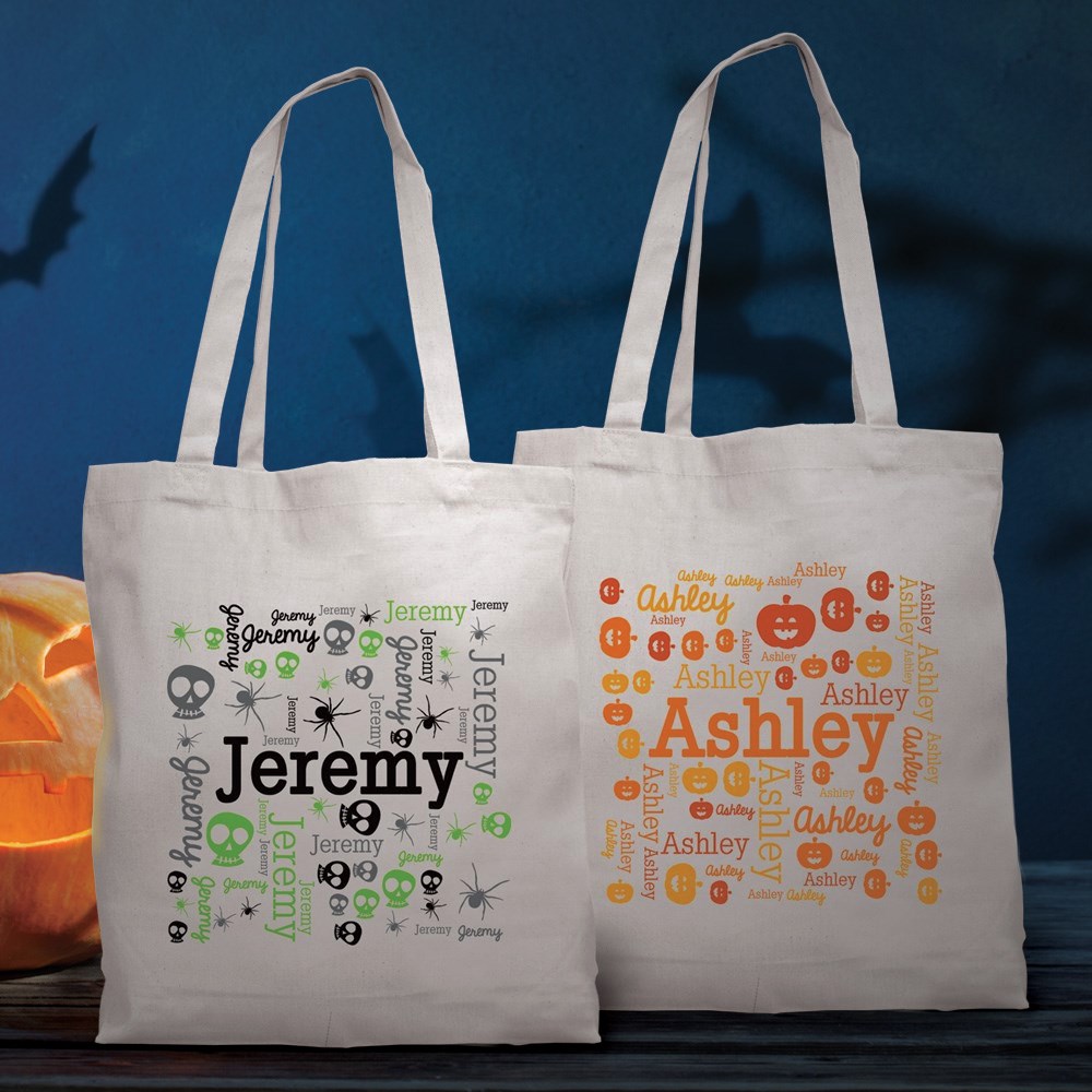 Make trick or treating an even more memorable experience with our Personalized Halloween Name Word Art White Tote Bag!