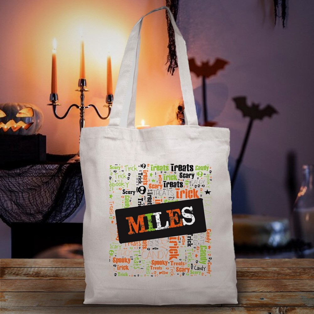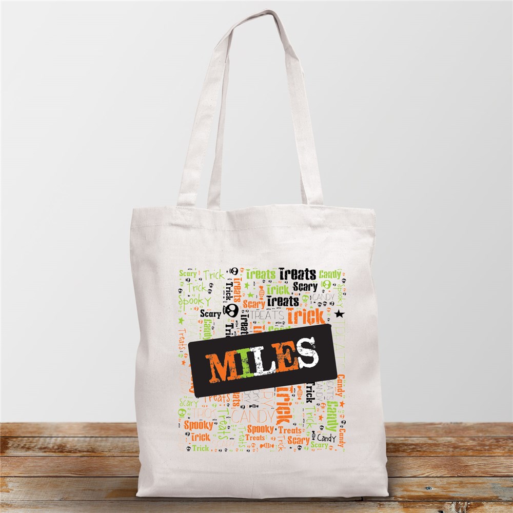 Create a fun bag to go trick-or-treating with like our Personalized Halloween Word Art White Tote Bag!