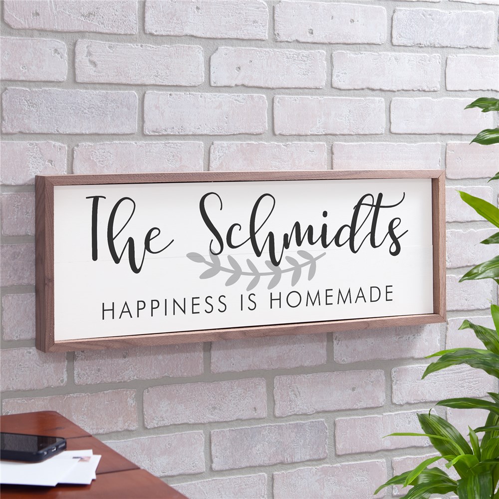 Happiness cannot be bought, it is homemade. Display your personal brand of family-happy with our Personalized Happiness Is Homemade Framed Wall Sign.