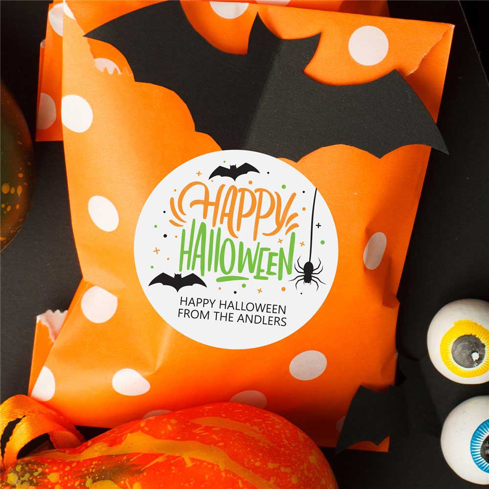 Whether you're baking sweet treats to hand out to friends or putting together party favors for your annual Halloween party, our Personalized Happy Halloween Circle Labels will be a cute personal touch!