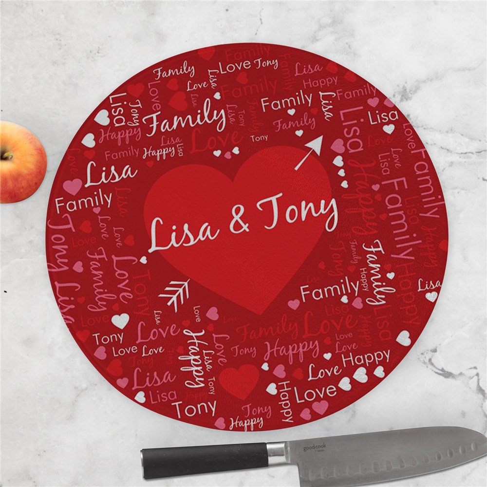 Personalized Couple's Heart & Arrow Word-Art Round Glass Cutting BoardPersonalized Couple's Heart & Arrow Word-Art Round Glass Cutting Board