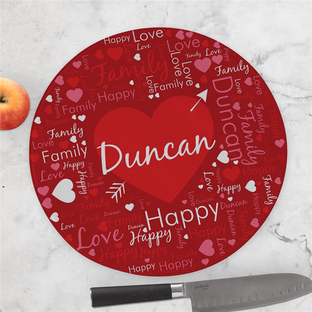 Bring some love to your kitchen with our Personalized Heart & Arrow Word Art Round Glass Cutting Board.
