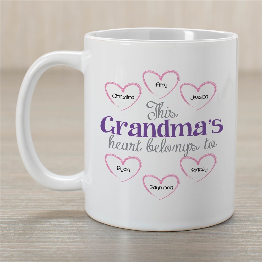 Grandmother Heart Coffee Mug - Personalized Heart Belongs To Coffee MugWarm your grandmothers soul with our Personalized Heart Belongs To Coffee Mug. Our Heart Belongs To design features hearts that can be personalized with names of the those grandma loves. Our Personalized Mug is dishwasher safe & includes FREE Personalization! Personalize your Mug choice with any title and up to 30 names. Grandma Gifts like these special mugs are available in different sizes ranging from 11 ounces to 20 ounces.