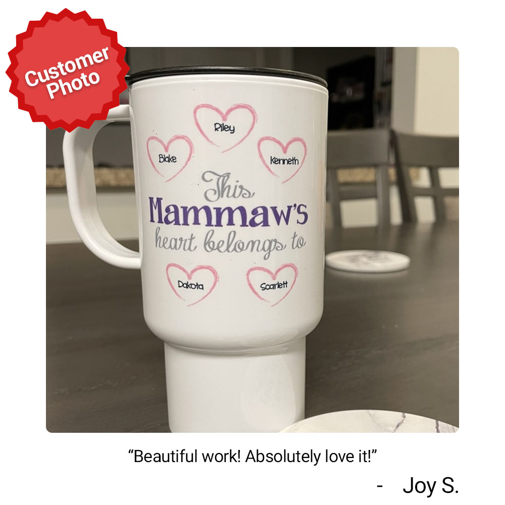 Grandmother Heart Coffee Mug - Personalized Heart Belongs To Coffee MugWarm your grandmothers soul with our Personalized Heart Belongs To Coffee Mug. Our Heart Belongs To design features hearts that can be personalized with names of the those grandma loves. Our Personalized Mug is dishwasher safe & includes FREE Personalization! Personalize your Mug choice with any title and up to 30 names. Grandma Gifts like these special mugs are available in different sizes ranging from 11 ounces to 20 ounces.