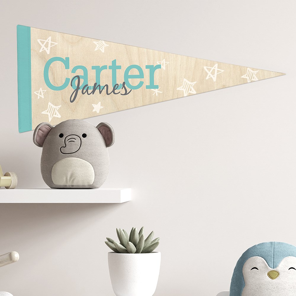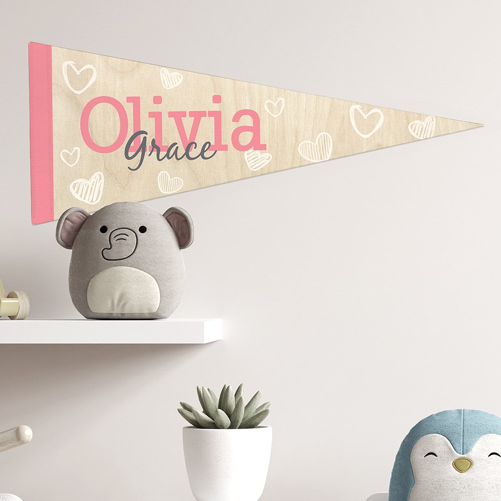 Make any kid's space as unique as they are with this Personalized Heart or Star Name Pennant.