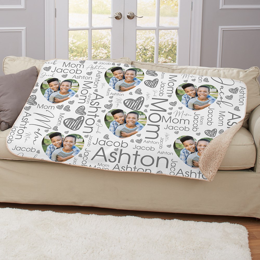 Keep Mom cozy and warm with our Personalized Heart Photo Word Art Sherpa Blanket!