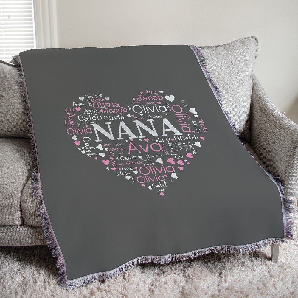 Wrap yourself in love when you use this Personalized Heart Word Art 50x60 Afghan Throw. This unique blanket will be personalized to your loved one using our exclusive word art tool. Add any title to make this throw just for her. Put family member's names in to create a design that is completely unique and customized to your home - you choose the color scheme, names and even icons. The Word-Art design will run off of the edge of the afghan. Plus our blankets make for touching personalized Mother's Day gifts. If you would like to see another rendition of your word art design simply select the View Your Personalization button again. This will automatically create another version for review.