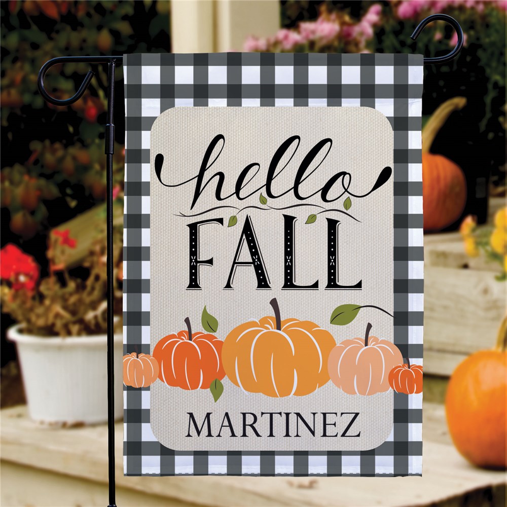 Welcome the spooky, colorful, sweater weather season that is fall with our Personalized Hello Fall Garden Flag.