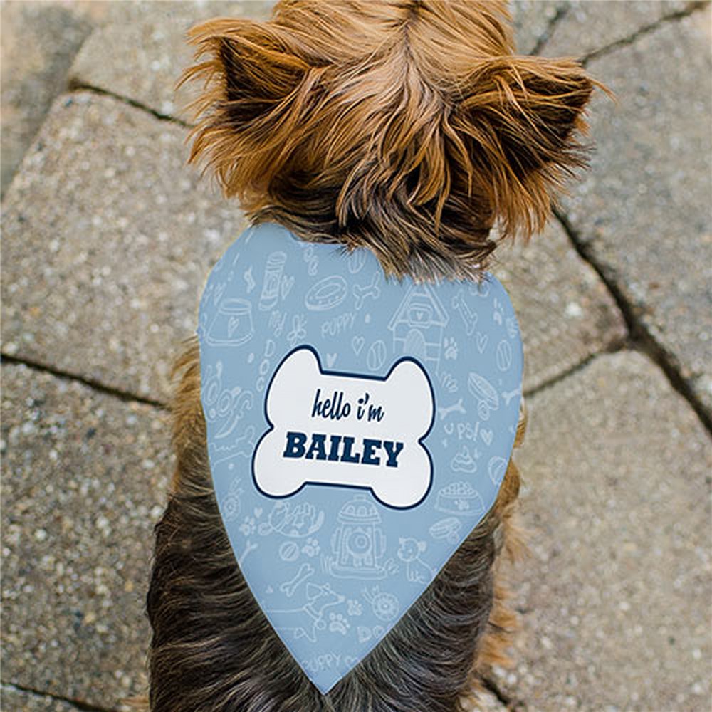 Personalized Hello Im... Pet Bandana - a cute and simple blue print with a classic bone shape to tell everyone who your pet is!