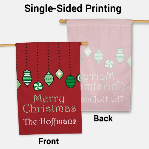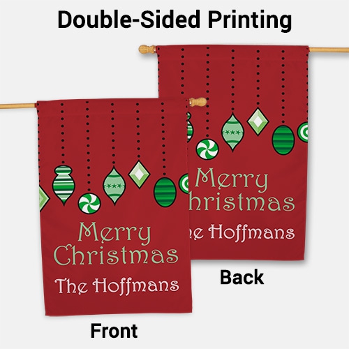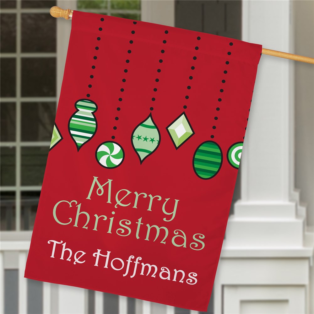 Spread the joy of the holiday season when you display this Christmas flag with custom message. Our festive Personalized Christmas Flags featurethe words Merry Christmas with holiday ornaments above and any one-line custom message up to 20 characters below.