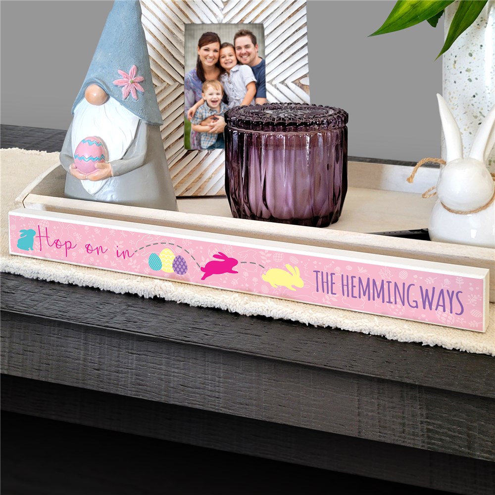 Every bunny will love this Personalized Hop On In Skinny Table Top Sign