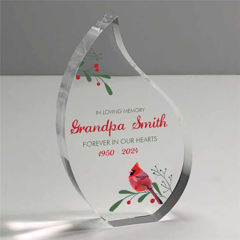 Celebrating the holidays without a friend or loved one can be incredibly tough, but you can keep their memory close to your heart with our Personalized In Loving Memory Cardinal Acrylic Teardrop Keepsake.