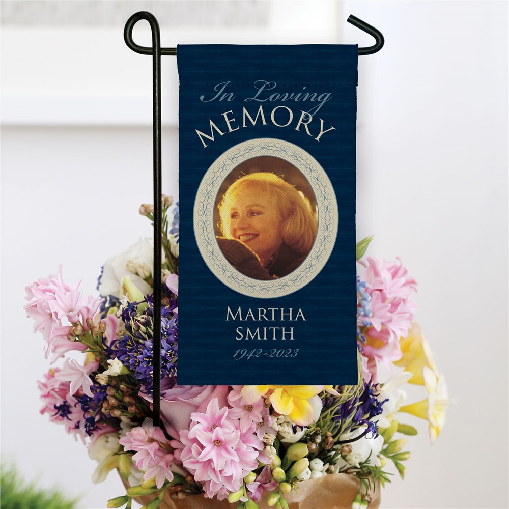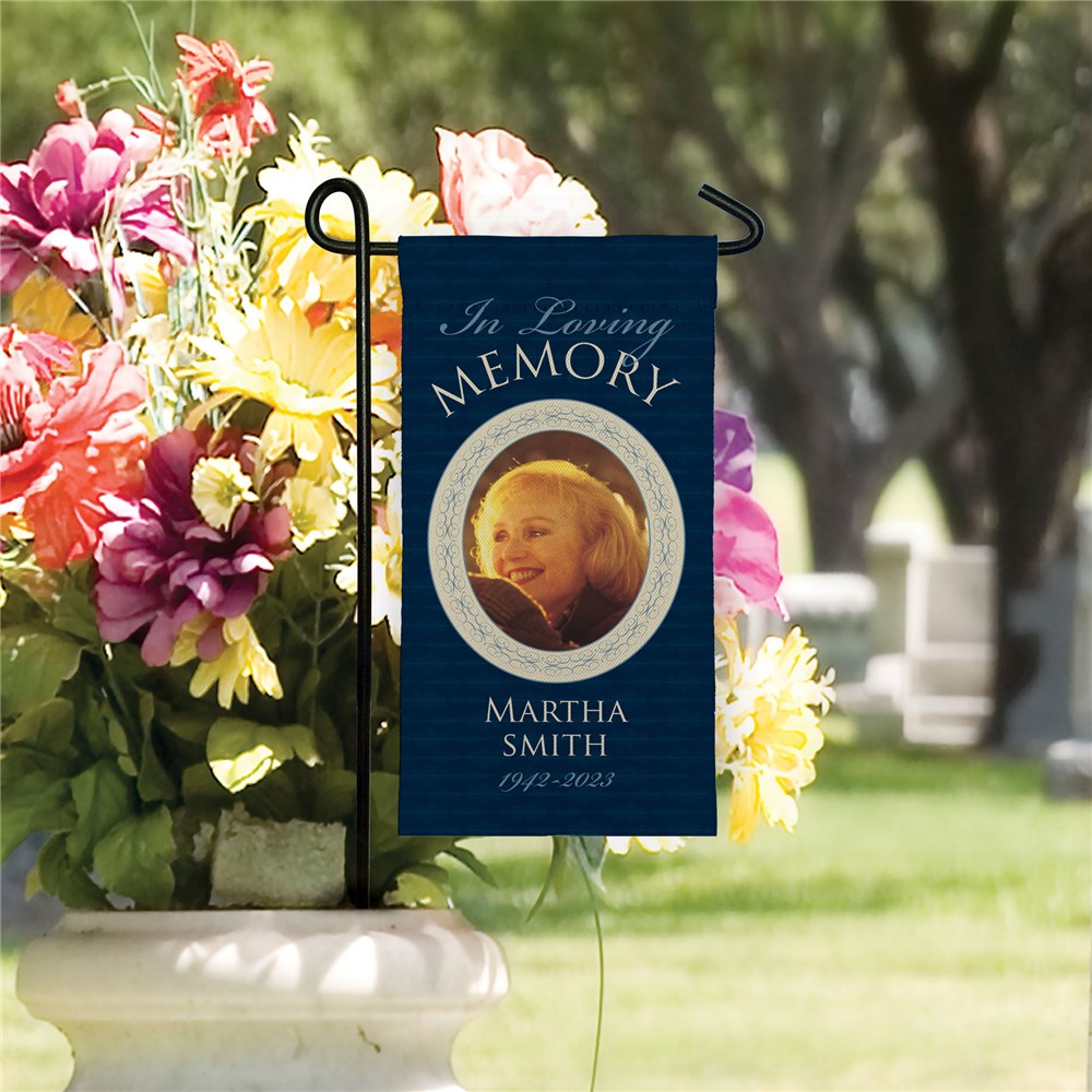 Give your lost loved one a special place in your garden when you display our Personalized In Loving Memory Photo Memorial Mini Garden Flag.Personalized with your favorite photo of them, any name, and memorial years.