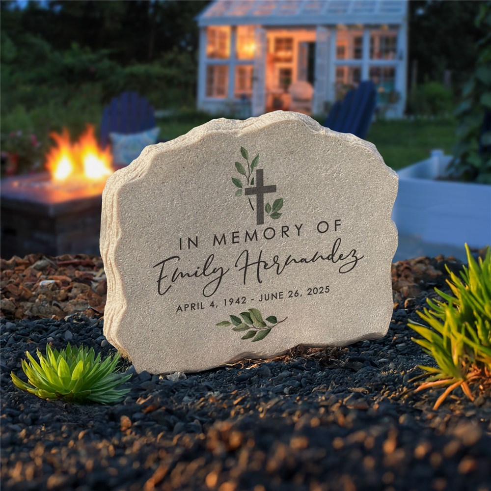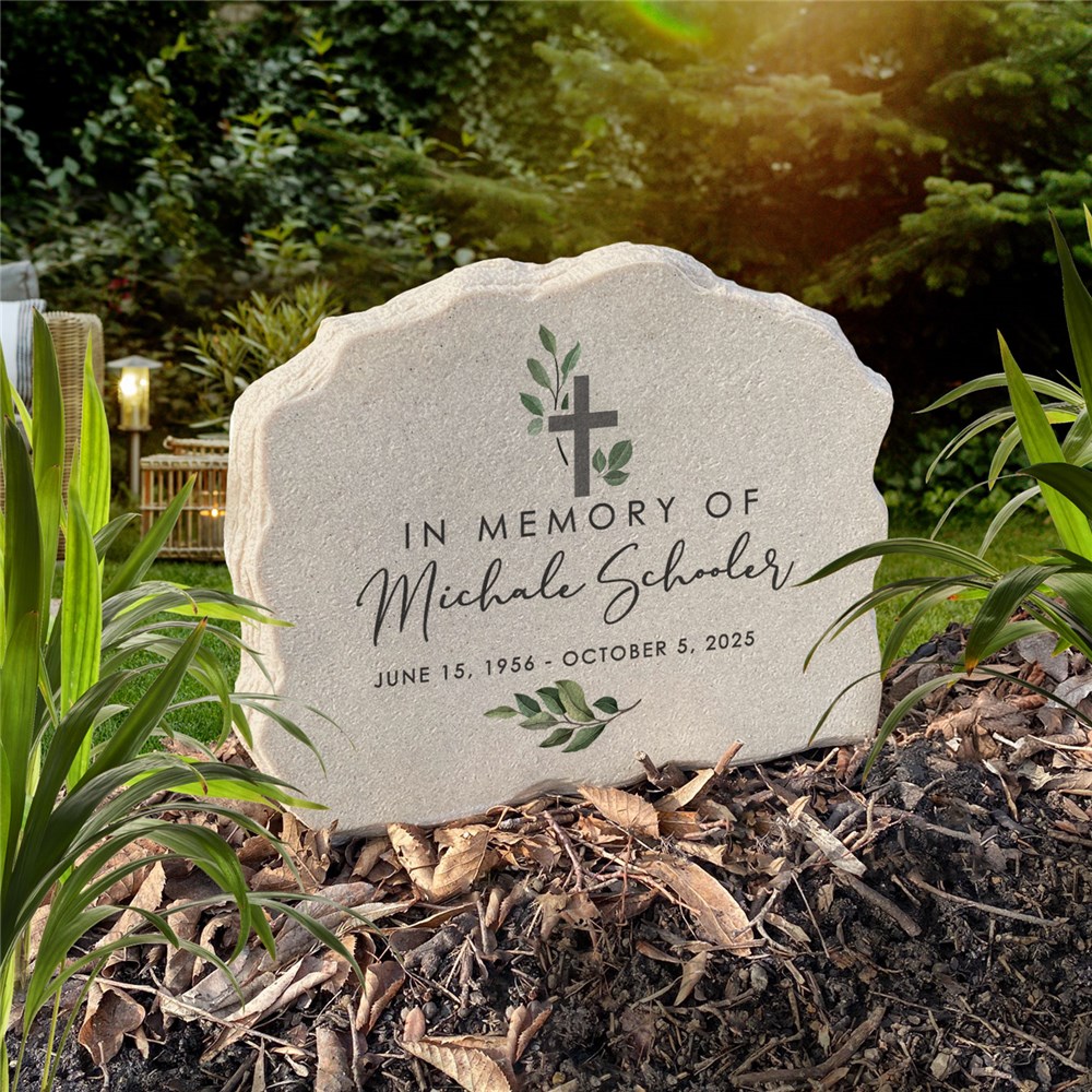 Honor a cherished life with our Personalized In Memory Of Standing Garden Stone. Featuring a graceful cross accented with green leaves at the top and bottom, this stone is a beautiful symbol of faith and remembrance. The words “In Memory Of” are displayed above your loved one’s name in elegant script, with full memorial dates beneath. Designed to stand securely in your garden, yard, or outdoor space, this heartfelt tribute creates a lasting way to keep their memory close.