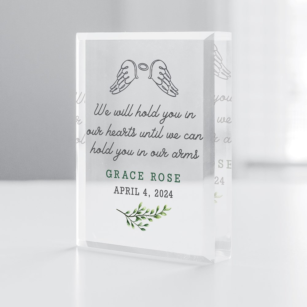 Our Personalized In Our Hearts with Wings Acrylic Keepsake is a beautiful way to honor the loss of your child.