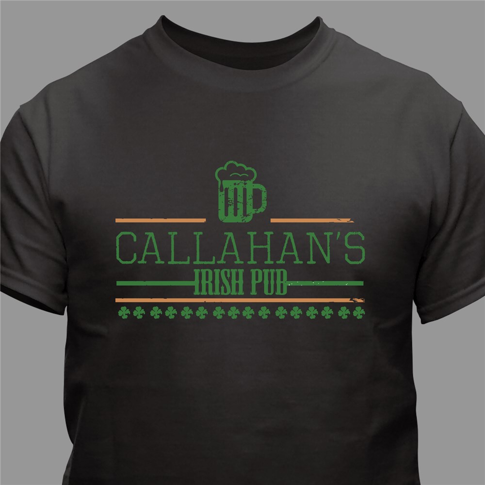 Celebrate St. Patty's Day in style with our Irish Pub Personalized T-Shirts! Our Personalized Shirt comes with any custom message line to wear with pride well enjoying your green beer. Makes great brag wear to celebrate your Irish heritage.