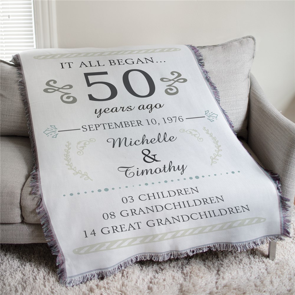 Our anniversary throw will be personalized with your anniversary year, wedding date, names, and any 3 custom message lines along the bottom.