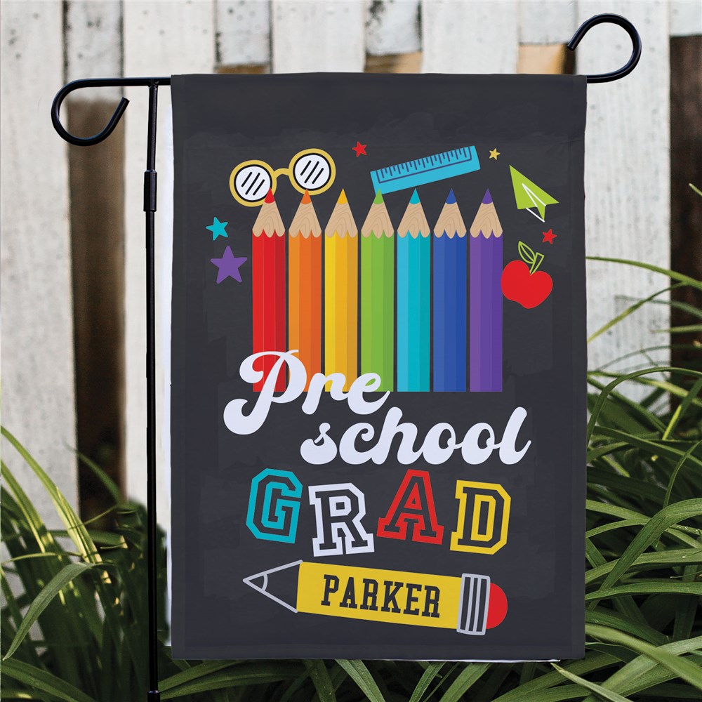 Featuring a fun, colorful pencil design and bold “Kindergarten Grad” or “Preschool Grad” text, this flag is the perfect way to show off their big achievement. Personalize it with their name for an extra special touch!
