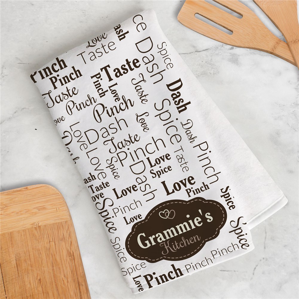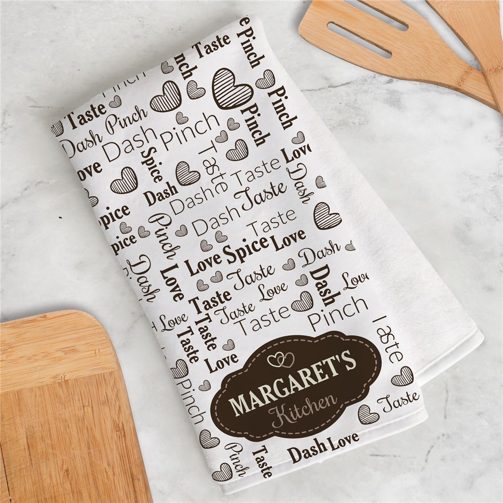 Show the special woman in your life you love what they bake up in the kitchen with our Personalized Label Word Art Dish Towel.
