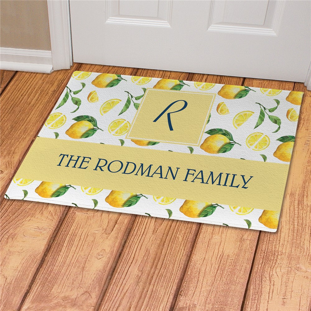 Add some beauty to your doorway with our Personalized Lemon Pattern Doormat. We will custom create our zesty lemon design for you with any initial and family name in your choice of background color, to make a spring or summer statement like no other.