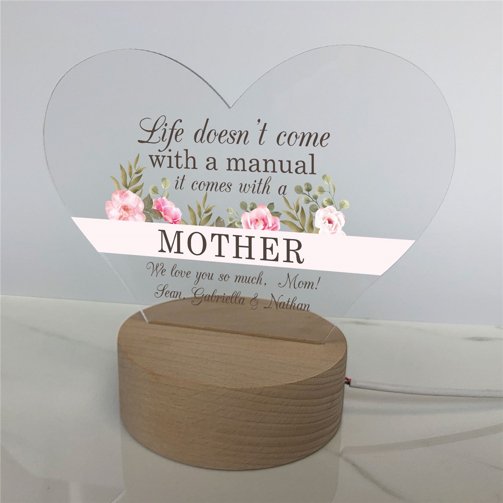 Thank Mom for all that she's taught you with our Personalized Life Doesn't Come with A Manual LED Heart Shaped Sign.
